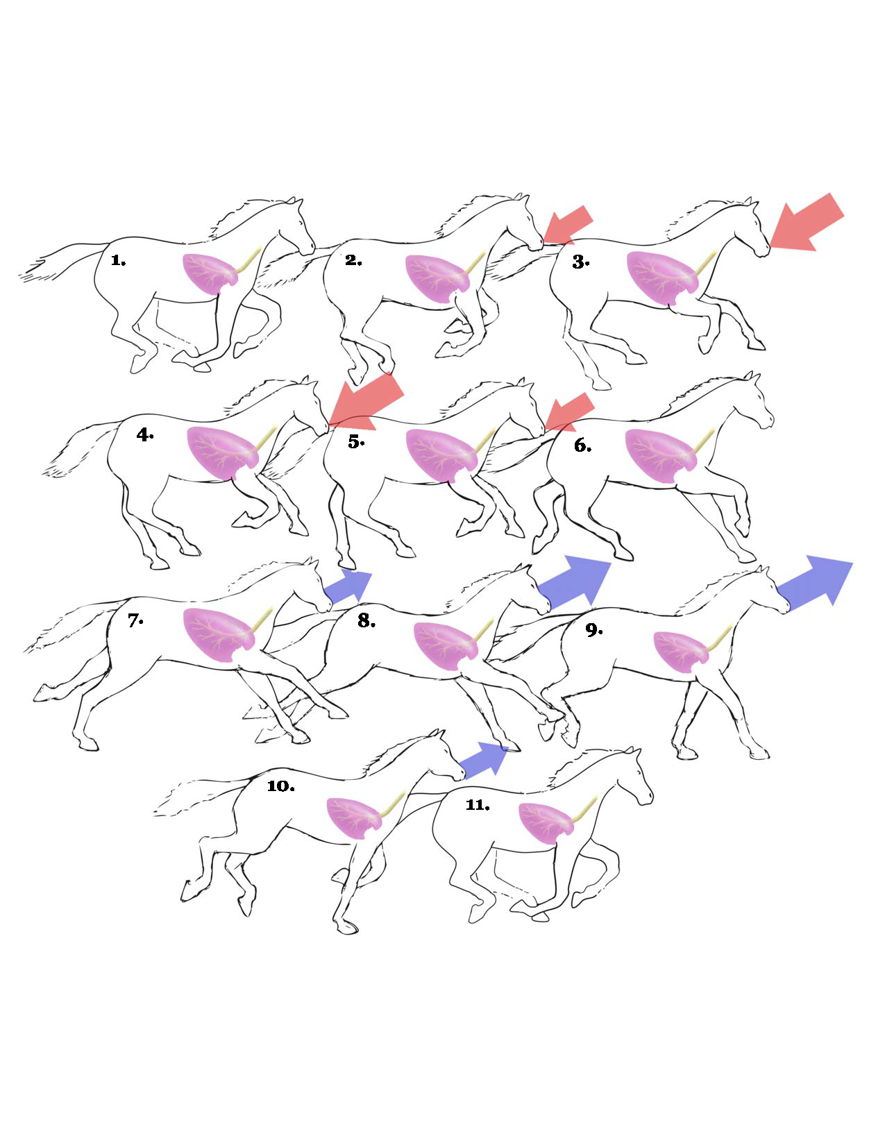 At a gallop, horses’ breathing and stride are linked 1:1 — one breath for each stride. The illustration shows air movement into and out of the lungs through one stride. Anything that impacts stride impacts breathing; anything that impacts breathing impacts stride.