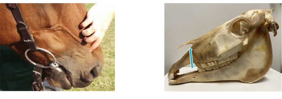 Referring to the photographs above, you can feel where the nasal passages collapse by putting your thumb and forefinger on a horse’s nose just below the eyes and by gently pushing as you slide your hand down the nose until the tissue collapses into the naso-incisive notch which is shown in the skeleton of the horse on the right. The nasal valve is located near the apex of the NI notch indicated by the blue arrow. FLAIR Strips support the nasal passages, particularly in the region of the nasal valve.