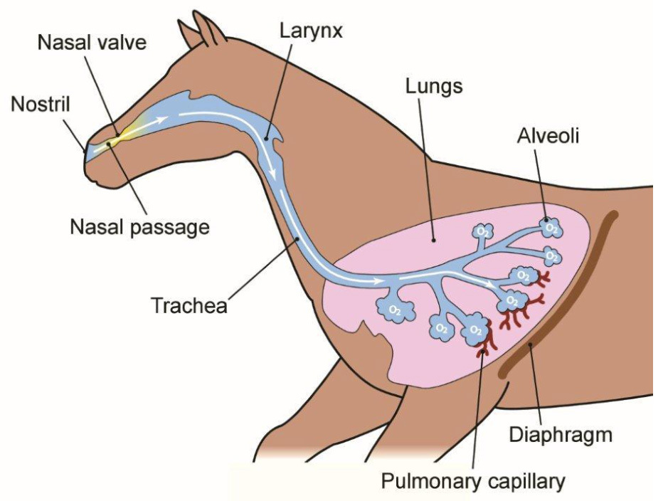 Unlike humans, horses are obligate nasal breathers, meaning they cannot breathe through their mouth during exercise. All oxygen needed to provide fuel for working must come through their nose. Any resistance in the airways makes it more difficult to breathe. Think about the resistance you feel breathing when you have stuffy nose. But at least you can breathe through your mouth. When running, horses can’t.