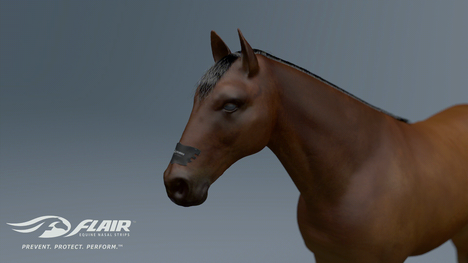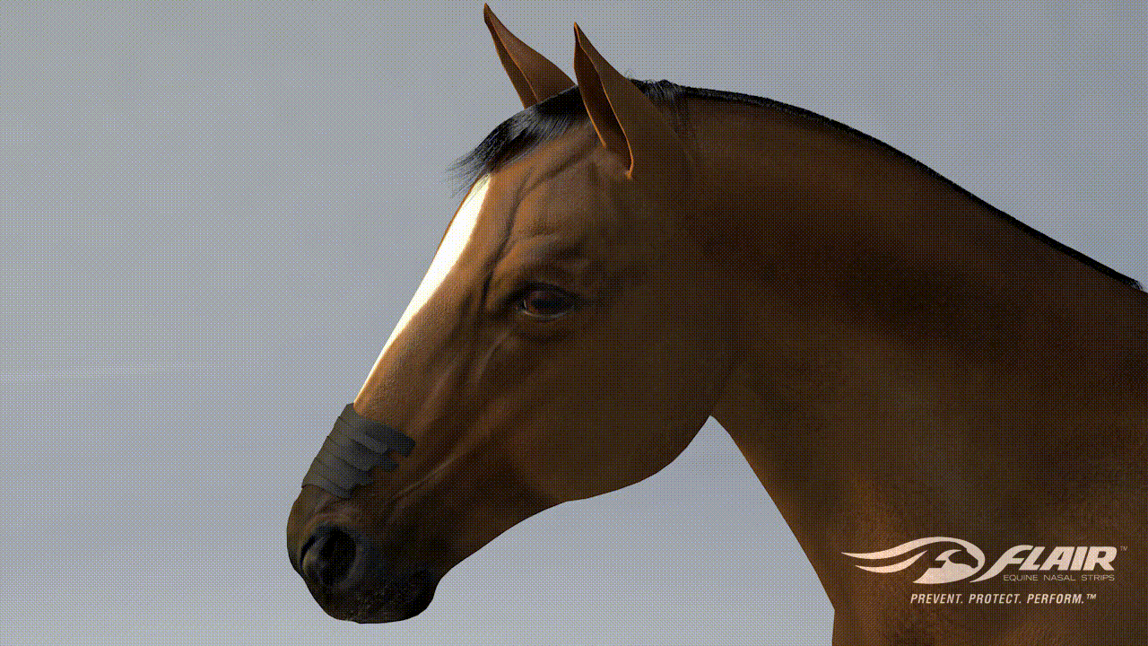 When horses breathe hard during intensive exercise, the soft tissues overlaying the nasal passages collapse, reducing the size of the upper airway. This reduction in size increases resistance to moving air into the lungs making it harder for horses to breathe when they need oxygen most. FLAIR Strips support the nasal passages so there is less collapse of tissue and less resistance to breathing during intensive exercise. Learn more below.